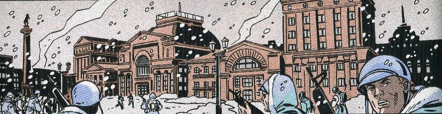 On pages 10-11, Snake's unit faces Russian exotroops, giant